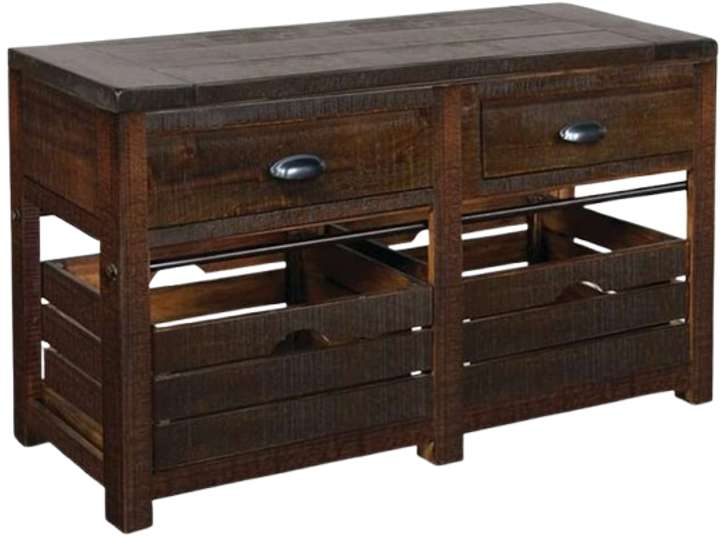 The Homestead collection offers a beautiful sofa table finished in a Tobacco Leaf finish. It features distressed mahogany solids and veneers, nut head metal pipe accents, framed raised panel sides, a removable crates, decorative hardware.