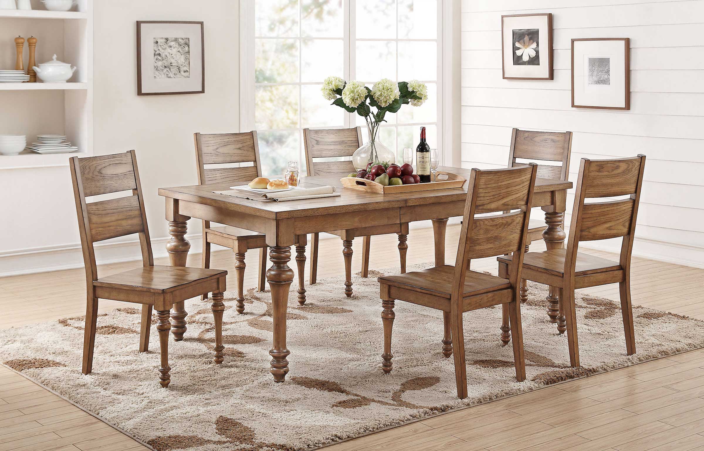 Substantial turned legs and distinctive oak wood grain pair with 2 different chairs for 2 different looks: an upholstered chair for a softer coastal look or a wood ladderback chair for an earthier feel.